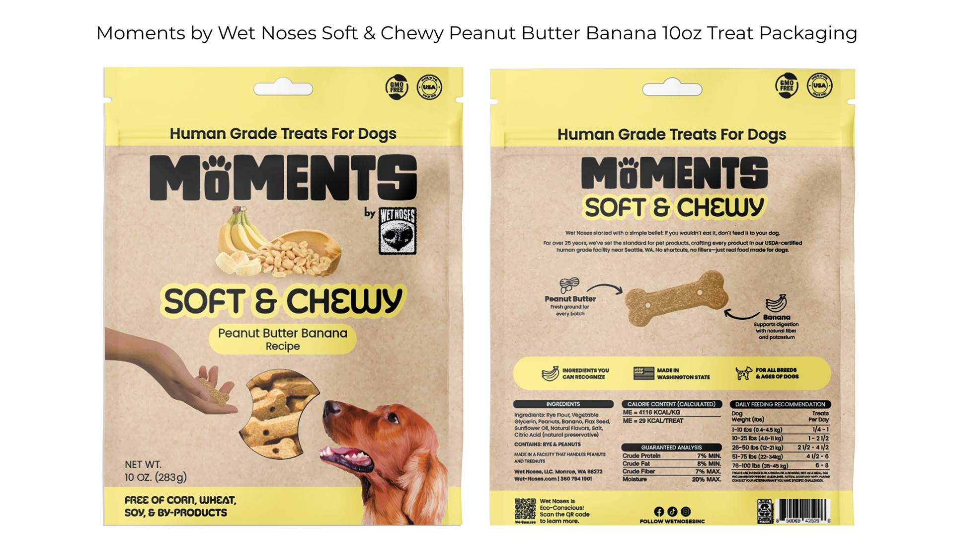 I designed the packaging for the new Moments by Wet Noses Soft and Chewy Dog Treat line. This included creating the Soft and Chewy logo and developing a full packaging system that fits naturally within the Moments family while introducing a fresh identity for the new line.