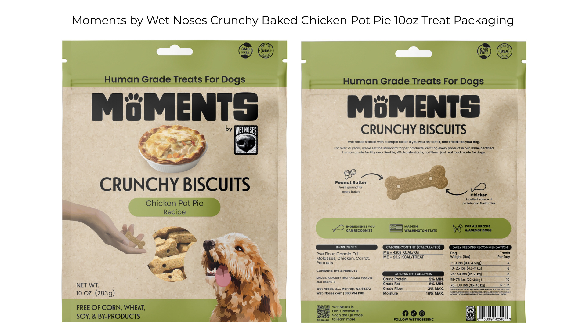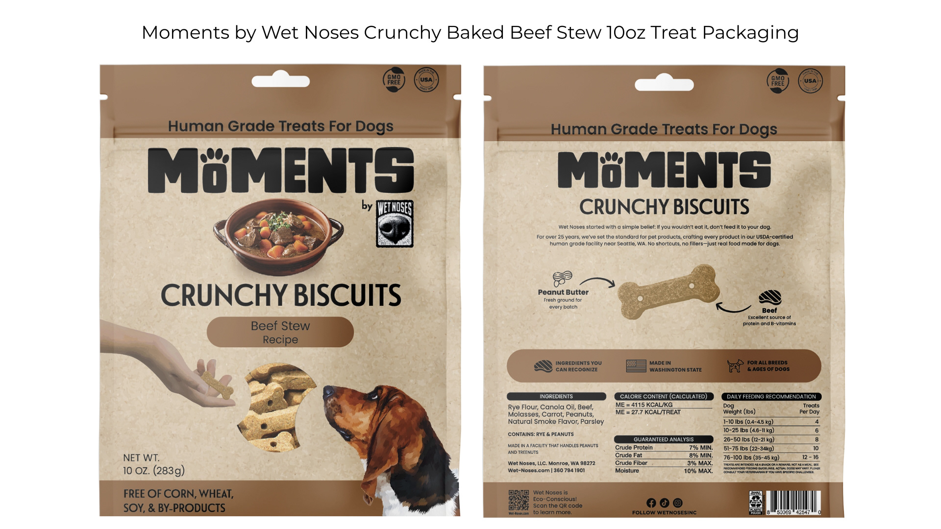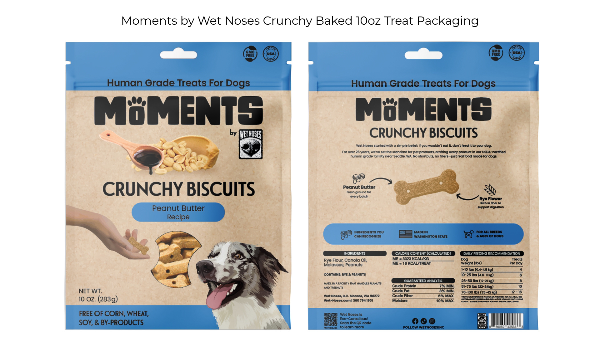 I updated the graphics, refreshed the storytelling, and built a layout that feels fresh but still connected to the original brand identity. The result is the new Moments by Wet Noses Bag Crunchy Treats, a more functional and visually engaging package that supports the growth of the Moments line.