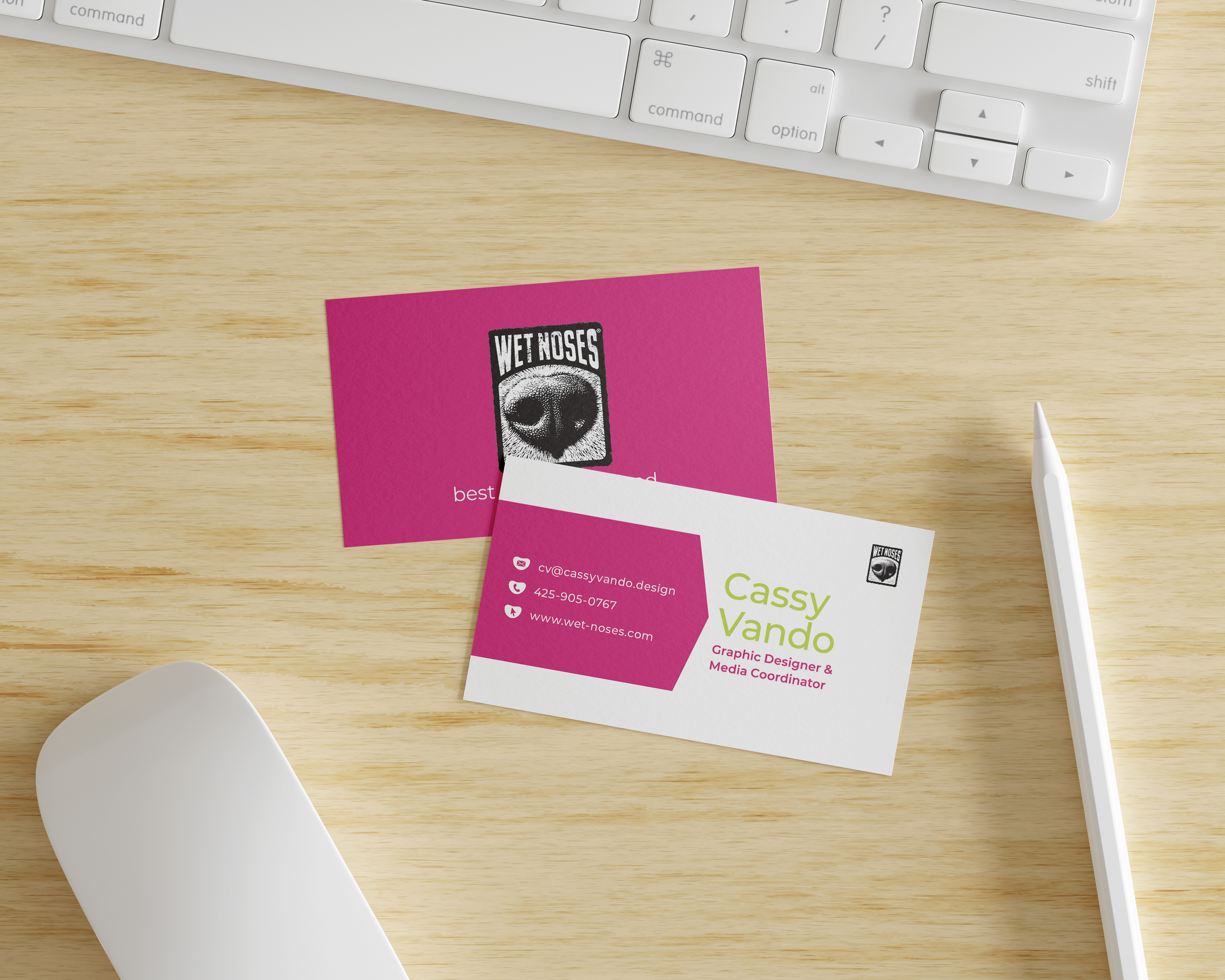 I prepared print-ready files and collaborated closely with the printer vendor to ensure high-quality production, delivering business cards that the Wet Noses team could be proud to share.