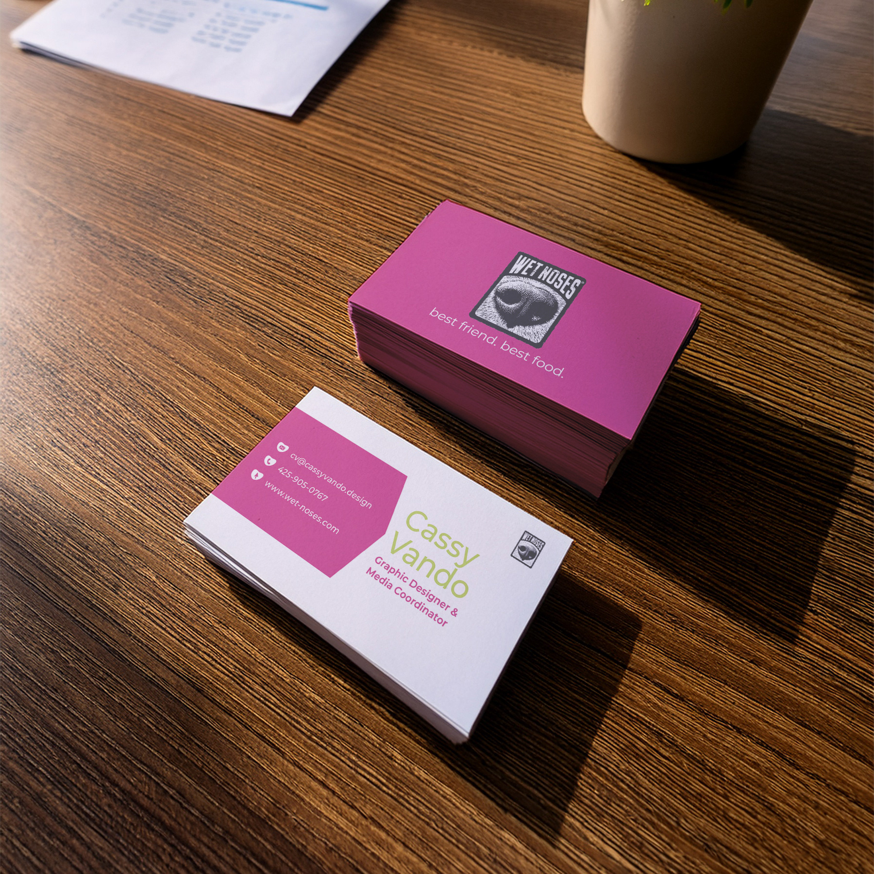 I designed the Wet Noses business cards from concept to final print, creating a design that reflects the brand’s personality while remaining professional and functional.