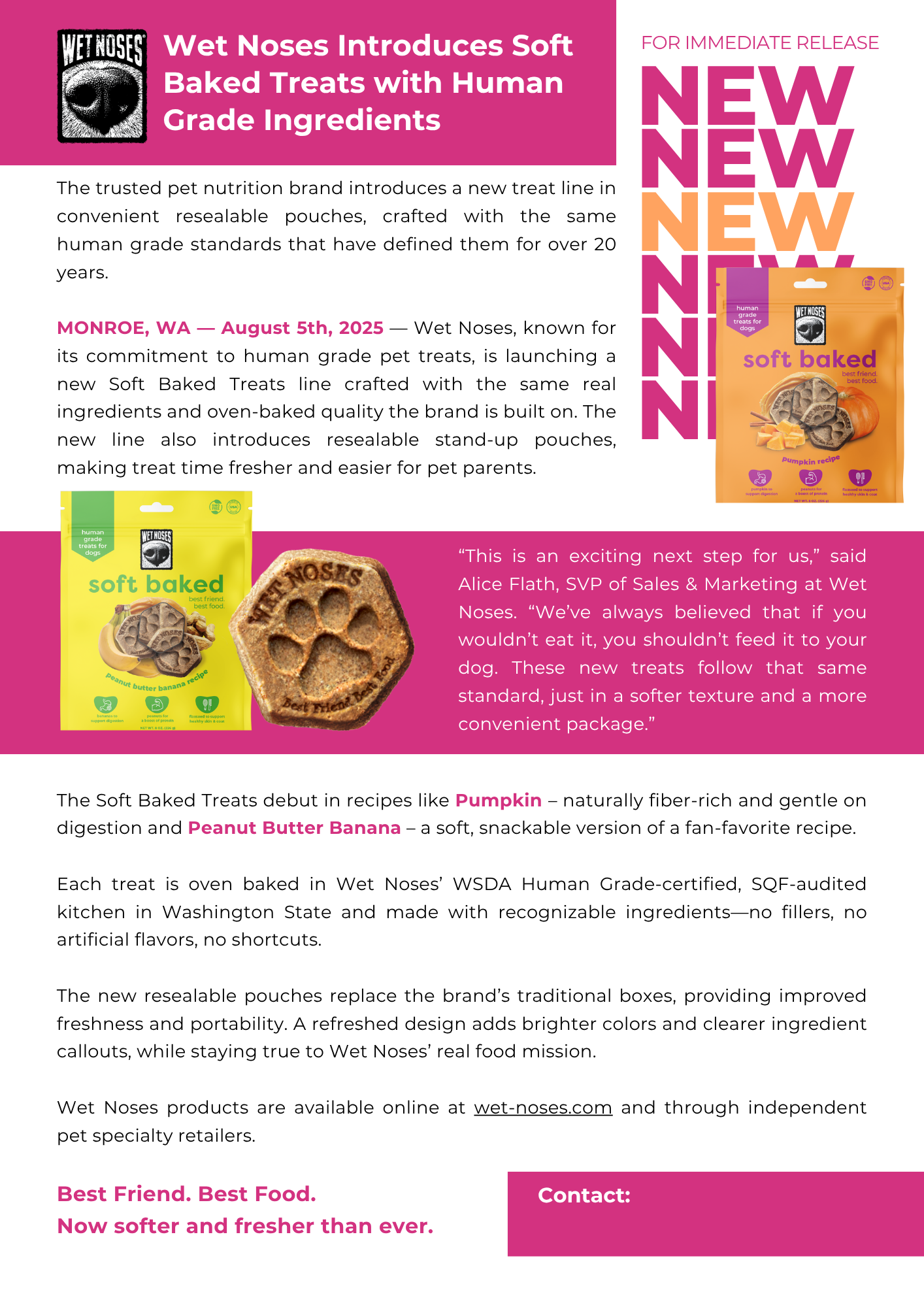 I collaborated on writing and fully designed the press release for Wet Noses’ Soft Baked treat line. The release was used to share the launch with media, retailers, and industry partners, combining strong storytelling with professional design.